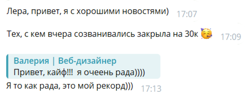 После одной консультации — взяла проект сроком на неделю за 30к, а после — ещё один проект на 50к. Улучшила своё коммерческое предложение и на созвонах теперь структурно умеет презентовать себя и свои услуги